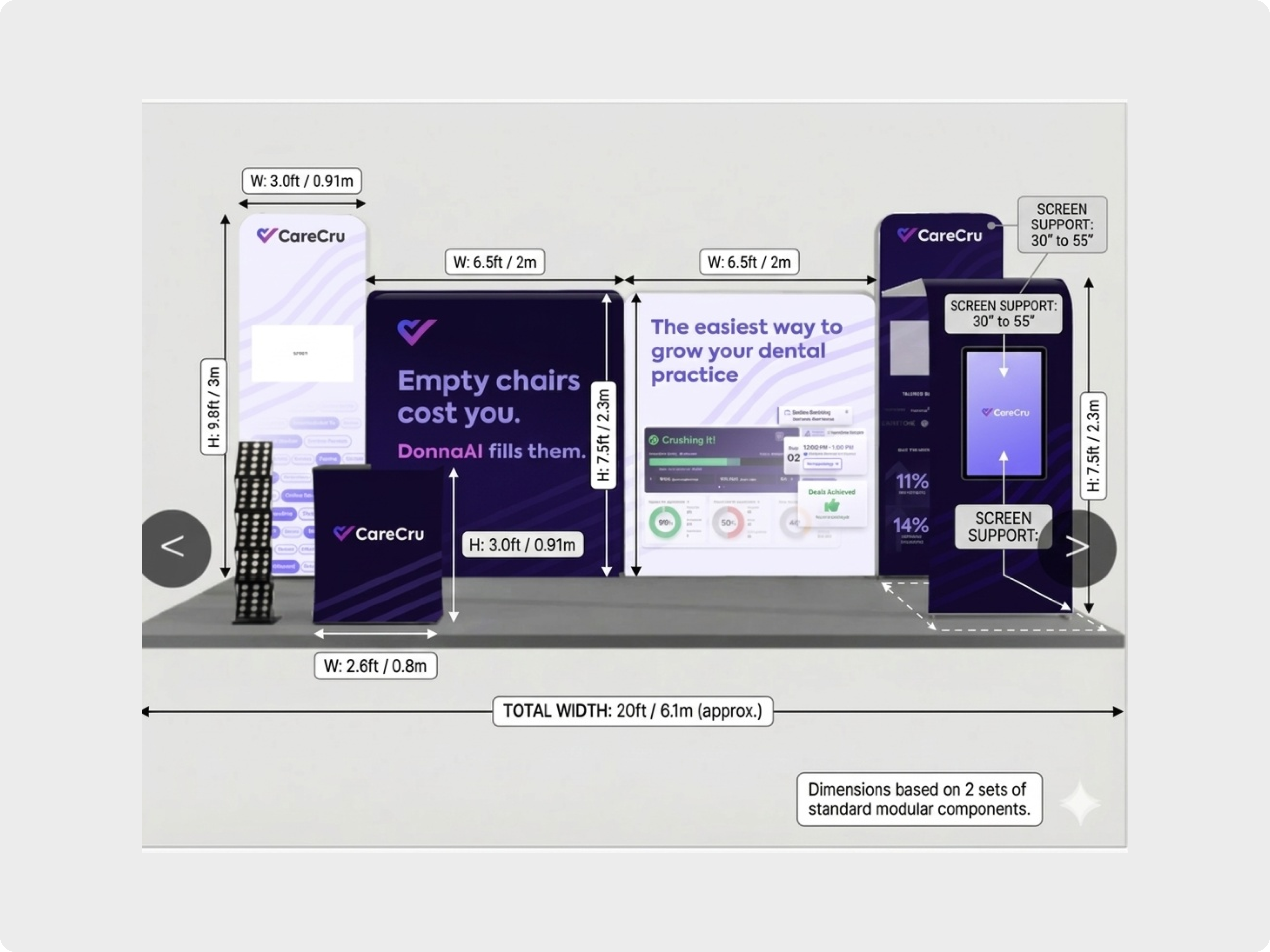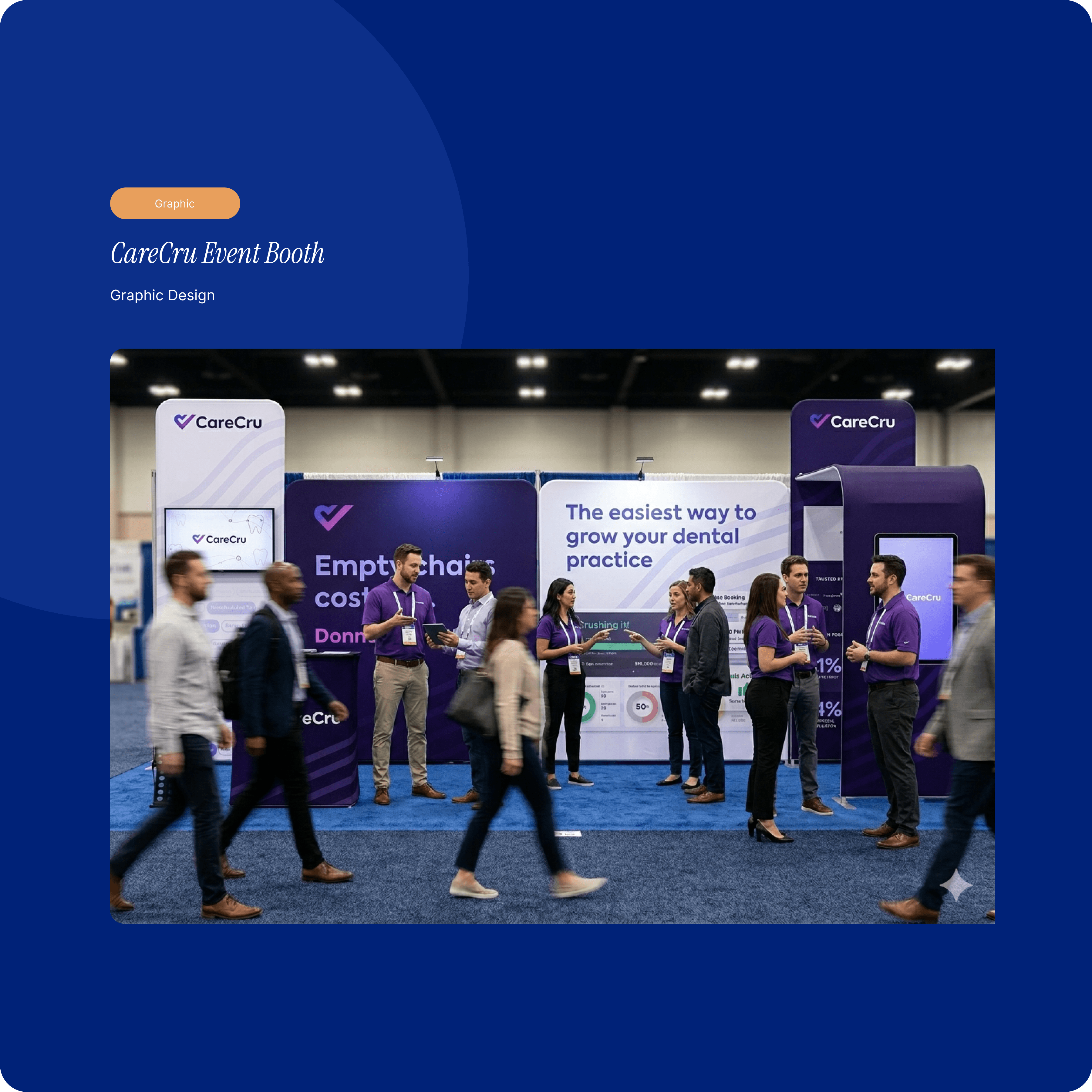 Design a trade show booth that captures attention within seconds, clearly communicates CareCru’s value proposition, and drives meaningful conversations with dental practices. The experience needed to simplify a complex, AI-driven product into a message that feels immediate, relevant, and easy to understand—while staying consistent with the brand and scalable across events.