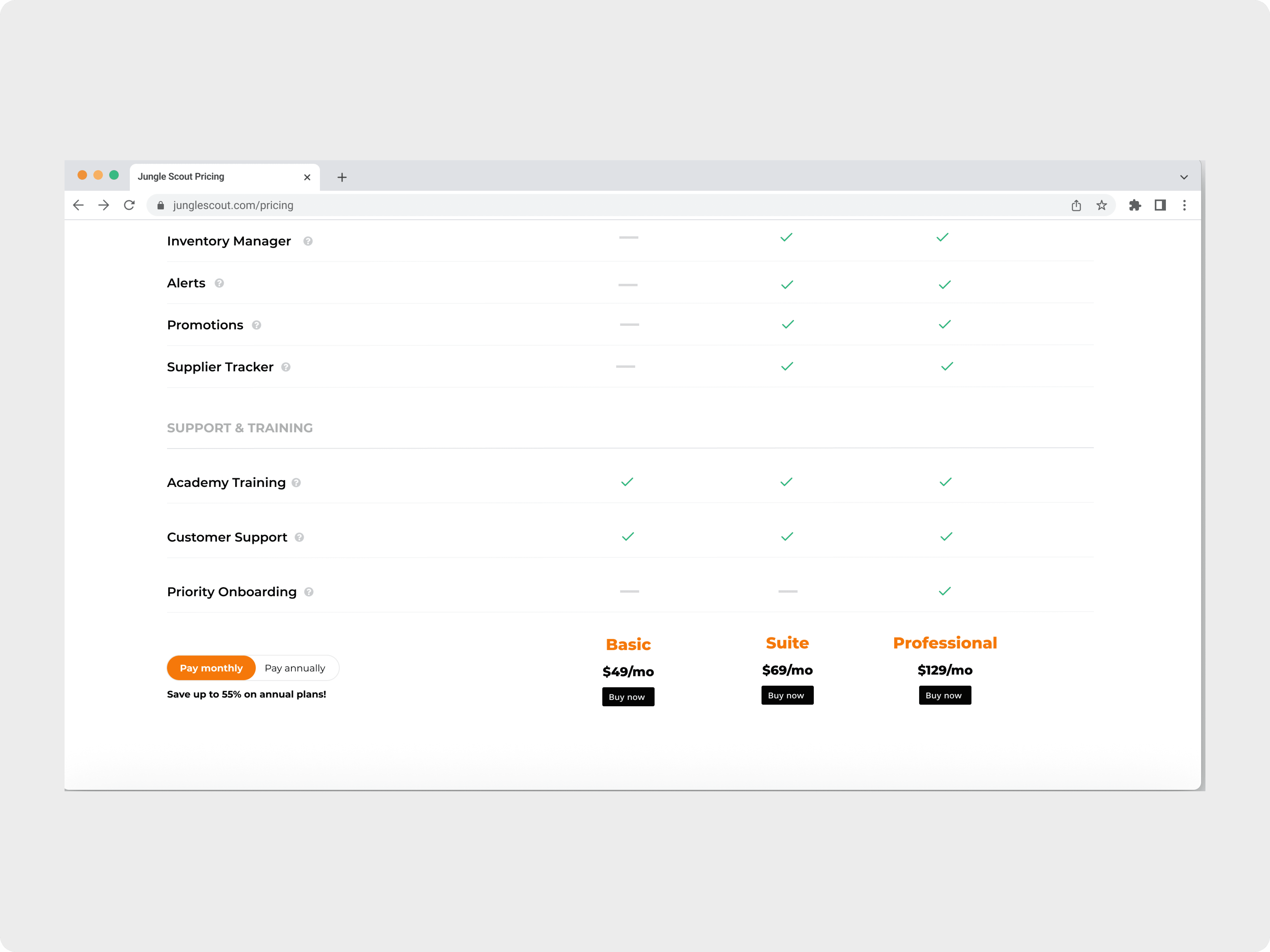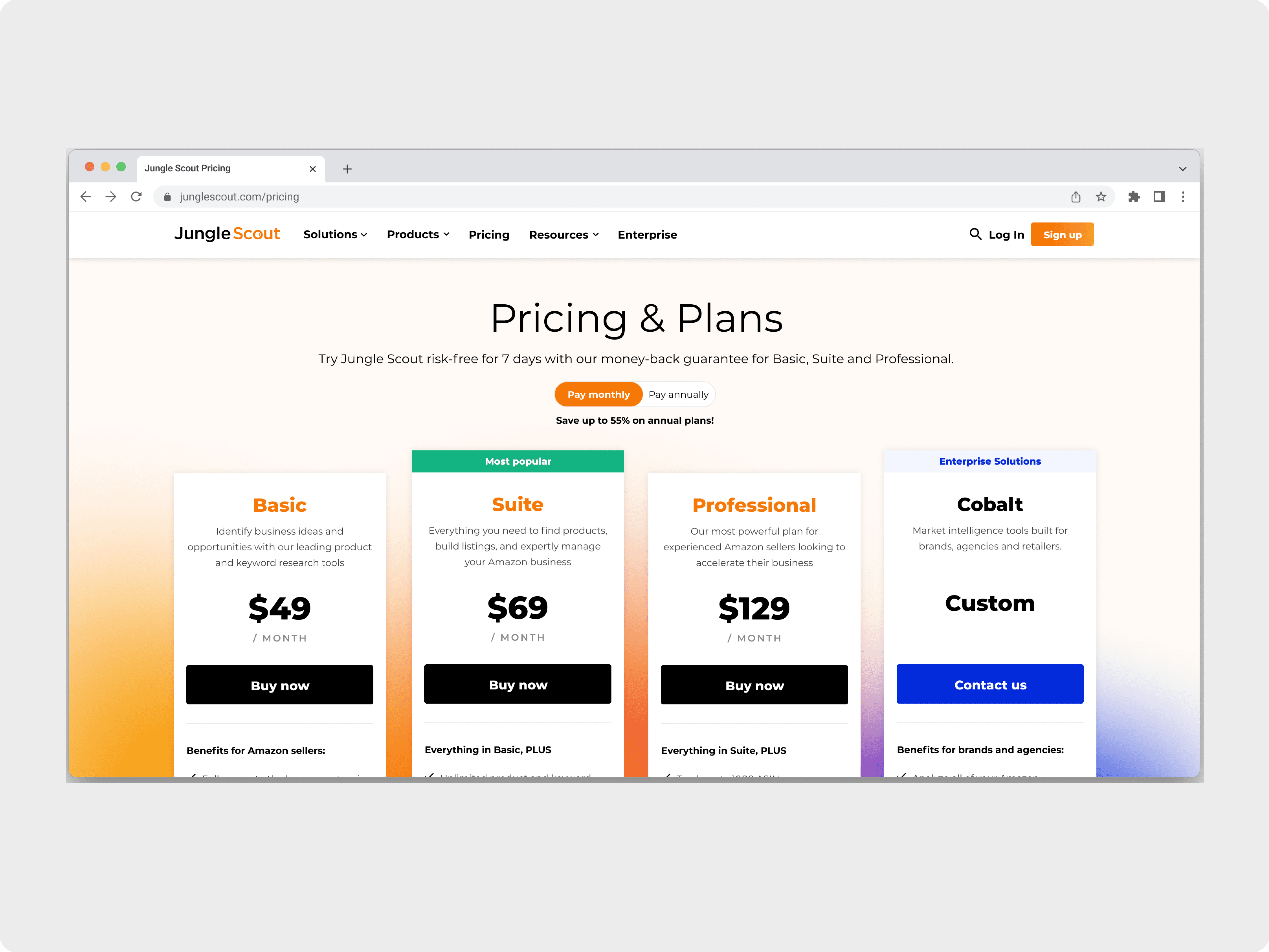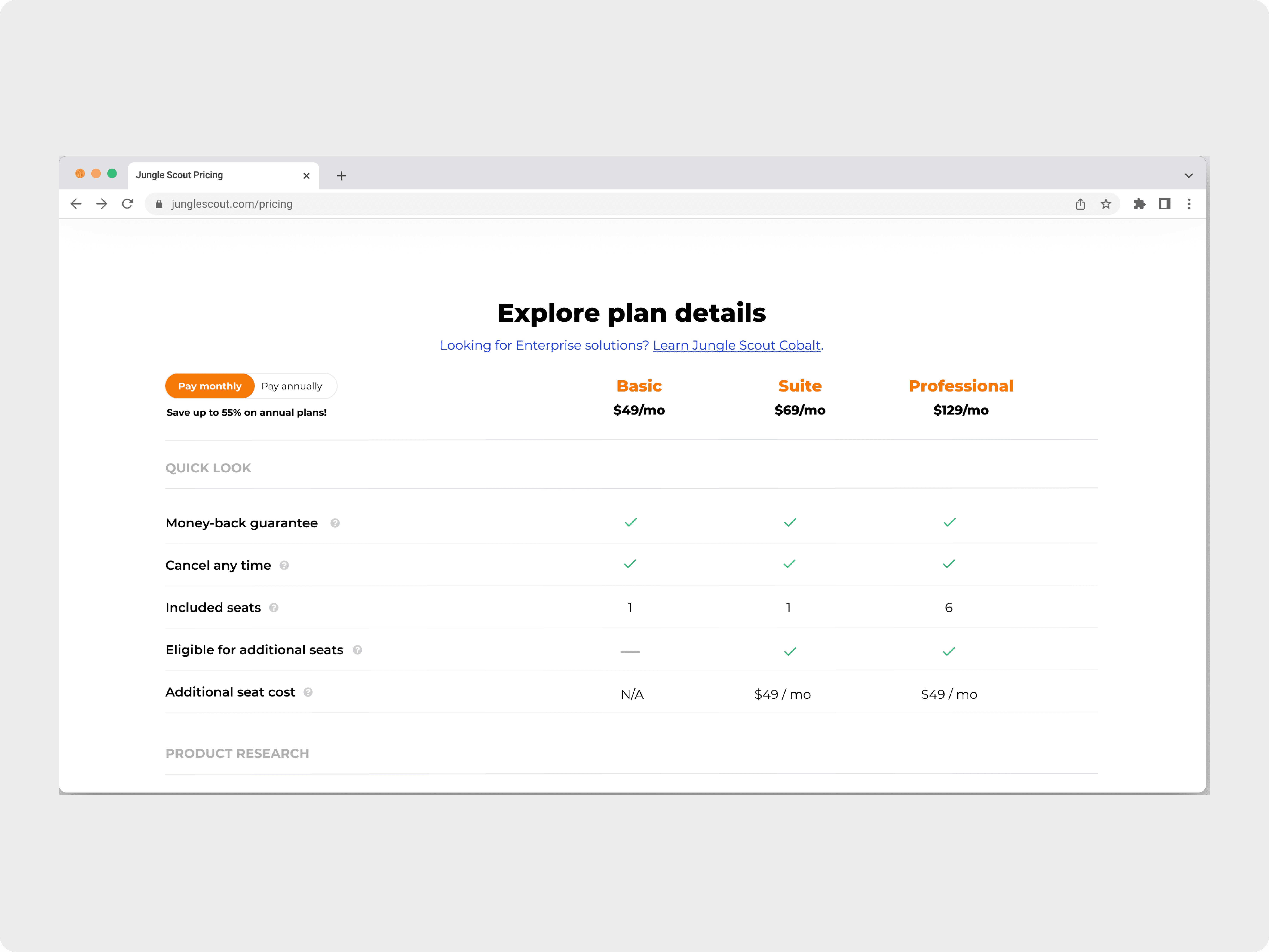 Led the redesign of Jungle Scout’s pricing page to improve clarity, reduce decision friction, and better support both SMB and enterprise conversions. The updated experience aligns with the company’s maturing brand while making plan value and differences easier to understand—especially on mobile.
